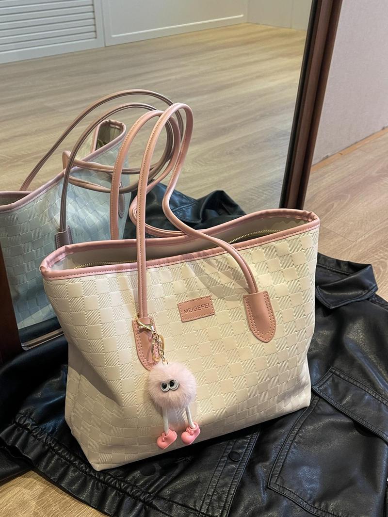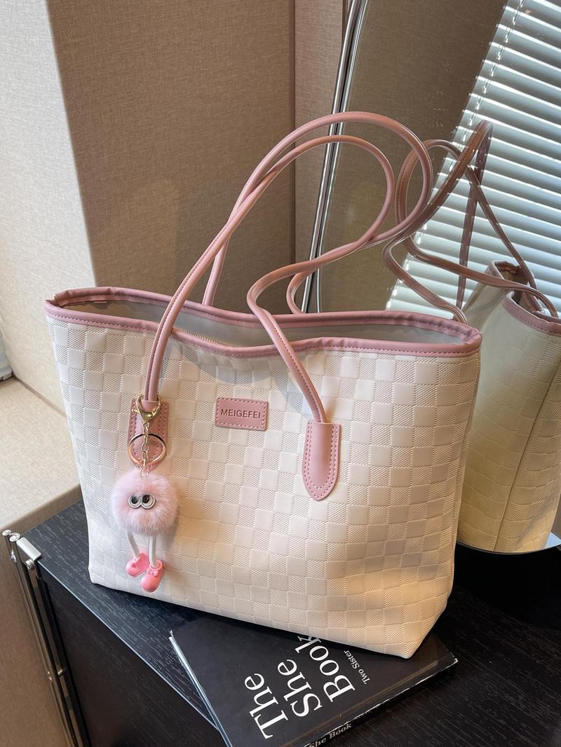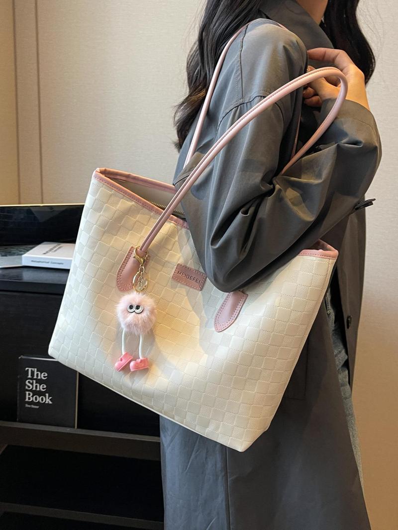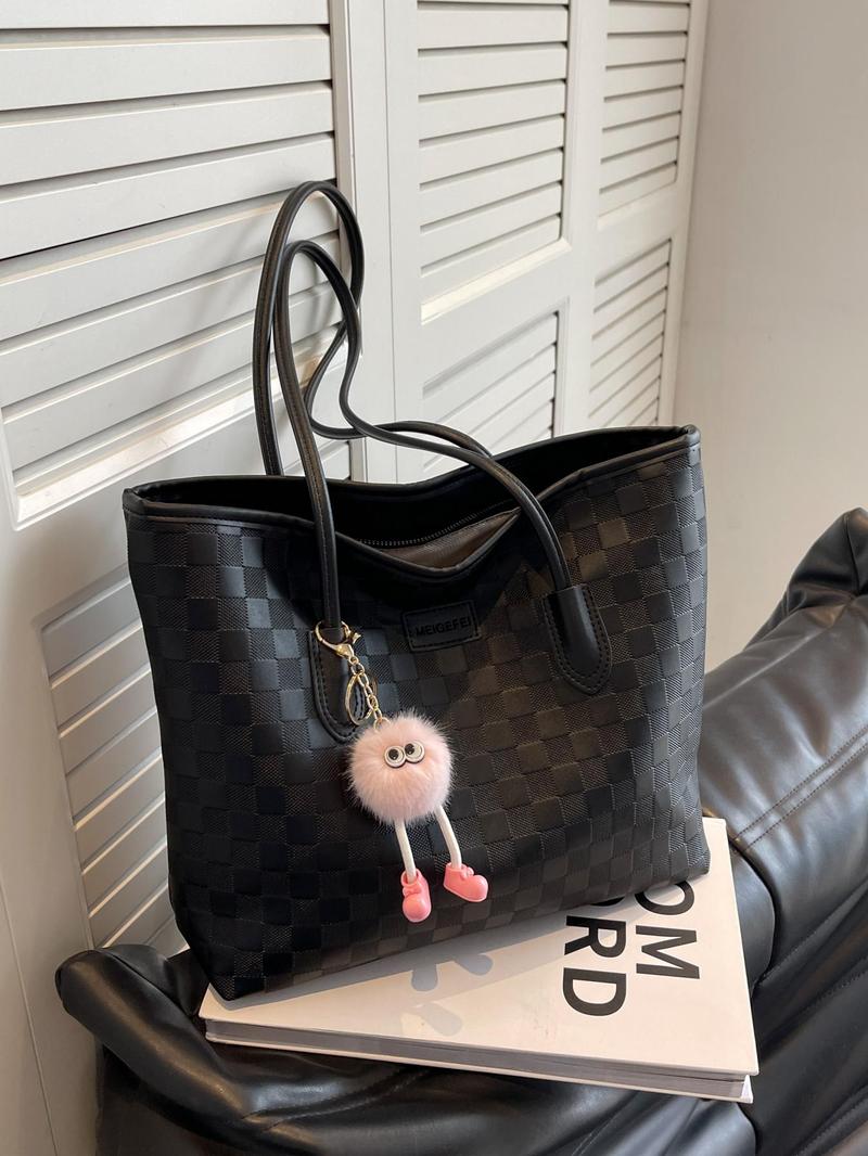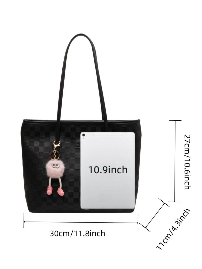 Fashion Plaid Pattern Handbag with Cute Pendant Large Capacity Shoulder Bag Suitable for Daily Use Casual Trendy Versatile High-Quality Daily Commute Bag
